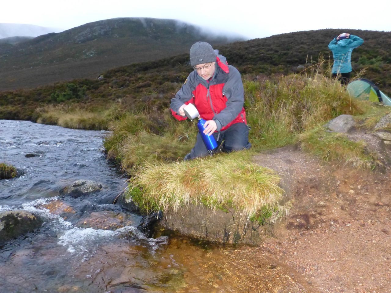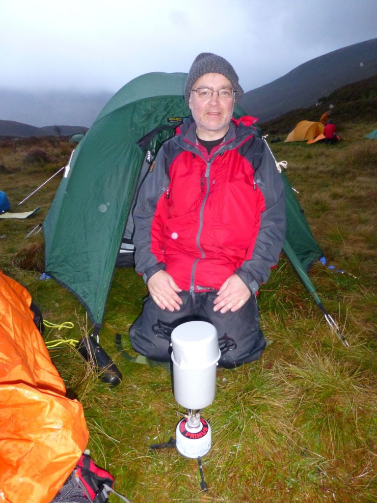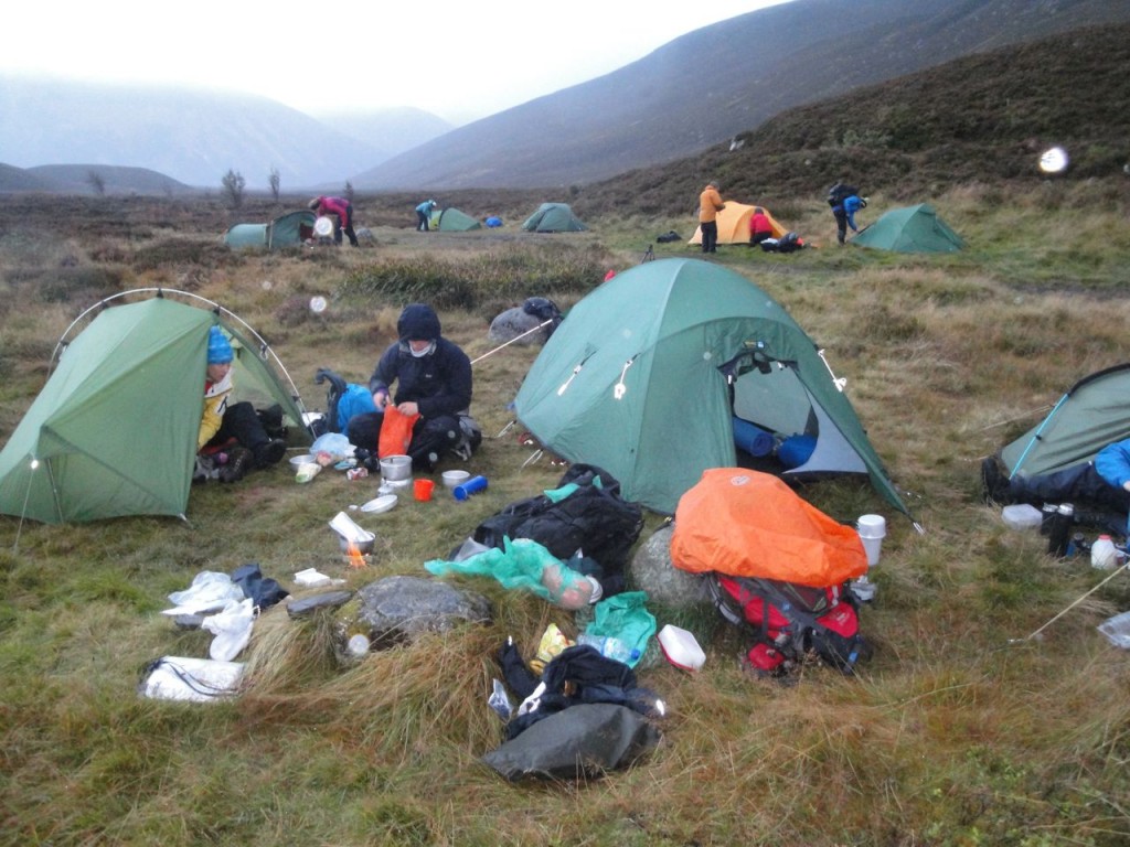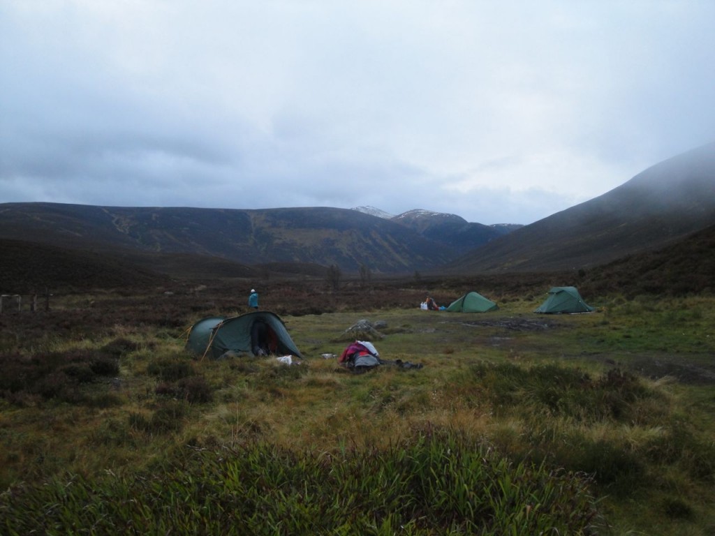 We eventually found the faint track on the valley floor and followed it up to Bynack Stables where we were to camp. I had managed to maintain a reasonable degree of dryness throughout the boggy terrain but within 250m of the campsite I stepped into a hidden pool and wetting both feet. The other group were already camped, tents up and cooking their tea.
