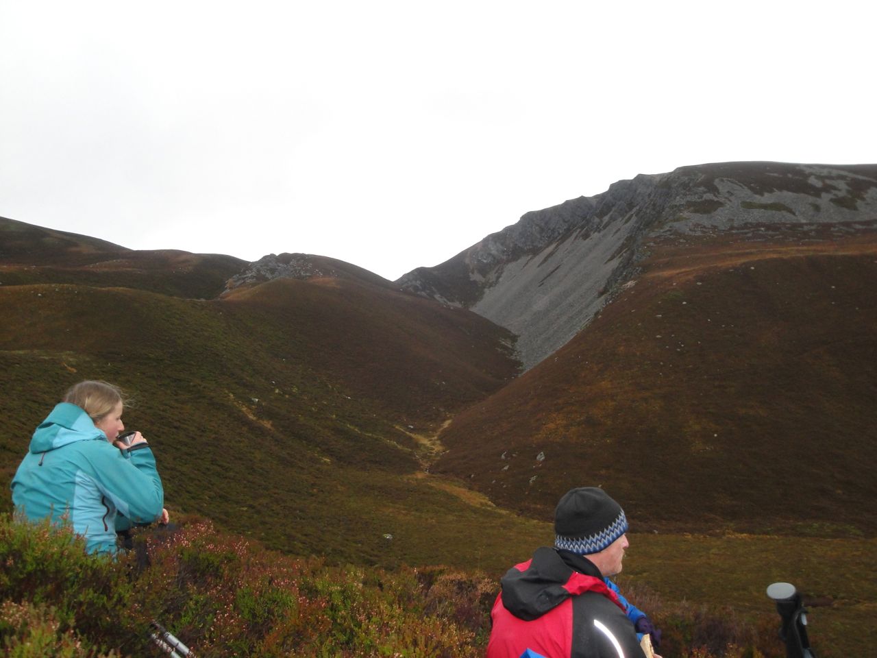 Once up the mudslides and out onto the hillside we stopped for a break near a gnarled ancient Scot’s Pine with Tom da Chiomhead across the burn.