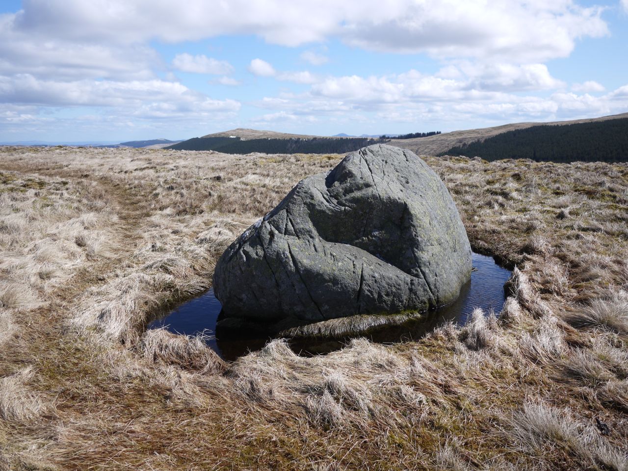 By Cairnmorris it was time for lunch but I had run out of anywhere to sit, the ground being mostly grass or boggy. But in the distance, perhaps 1km away, I spied an erratic and decided it would be my seat for lunch. Once I reached it, however, I found it defended by a moat. There was no way to get onto it with dry feet. Luckily, just a little further along I found a dry spot sheltered by the shoulder on which the erratic stood, and was able to enjoy my sandwiches while looking down on the reservoirs.