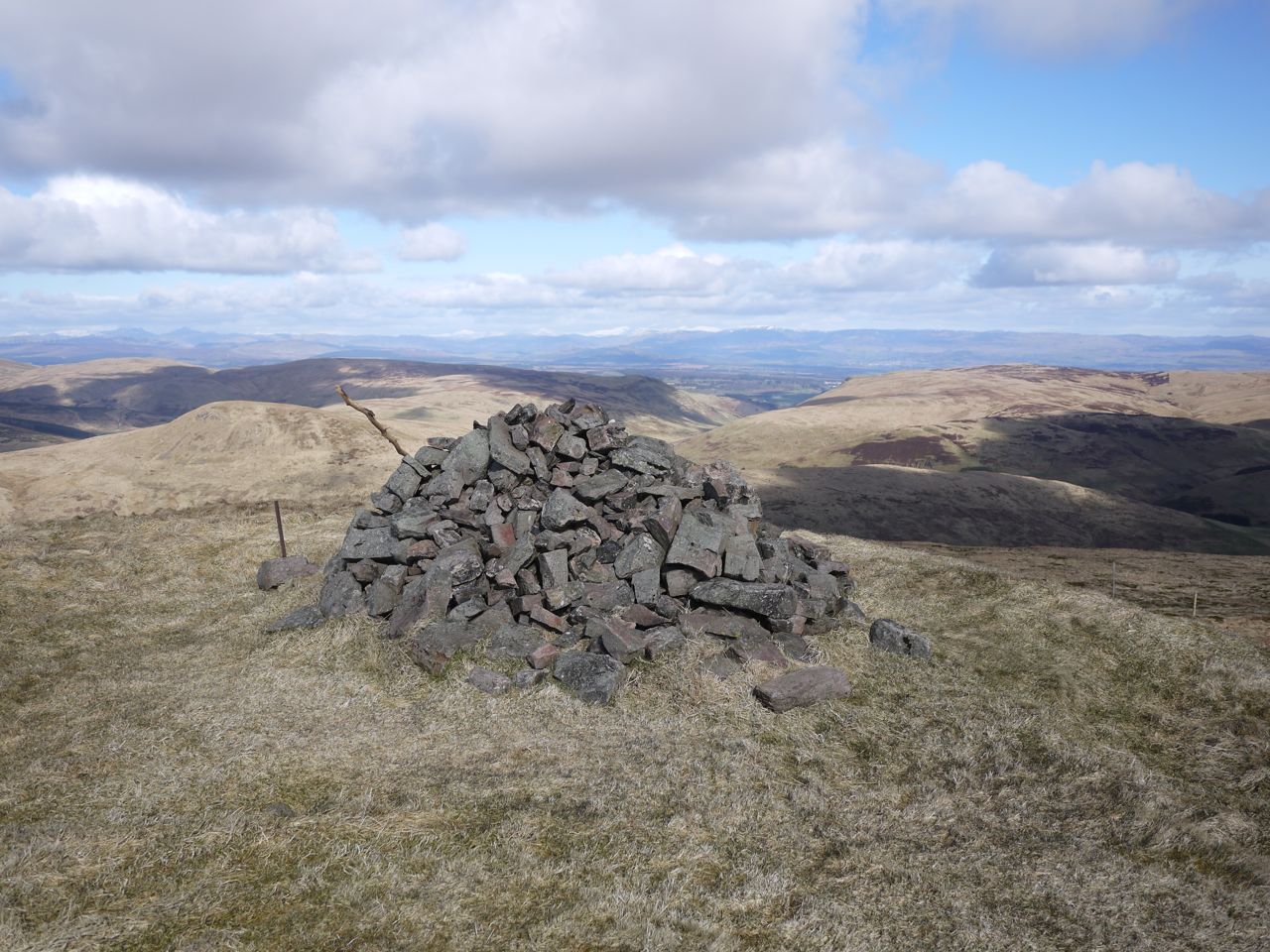 Tarmangie was then only a short walk along the ridge. I could see a number of people milling about at the summit of Tarmangie but they had gone by the time I got there. As I plodded along the ridge in my hat, gloves, and jacket I passed a couple of lads walking along in shirts and shorts, their exposed skin bright red. Fell runners exhibiting their rare walking behaviour on a flat section. Tarmangie, a little like Innerdownie had a brief steeper climb to its top. Its cairn was a little lower than the true summit. There is a stile here which I commandeered as a seat to have my elevenses, taking care not to put my rucksack down in the patches of snow.