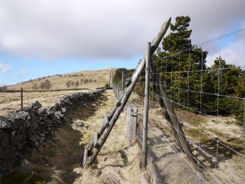 For once, the tree lined horizon ahead of me was actually the ridge and not a false horizon. Some of the trees left at the apex of the ridge looked to be prostrate forms, having presumably been blown over in some past maelstrom. As I approached the trees I could spy a deer fence just beyond them and beyond the trees was a ladder stile, so presumably my route is in regular use. I had climbed in bright sunshine in a tee-shirt but once on the ridge a cold wind soon had me in jacket, hat and gloves. It was a north wind so I’m surprised I hadn’t felt it on the climb through the baby trees.