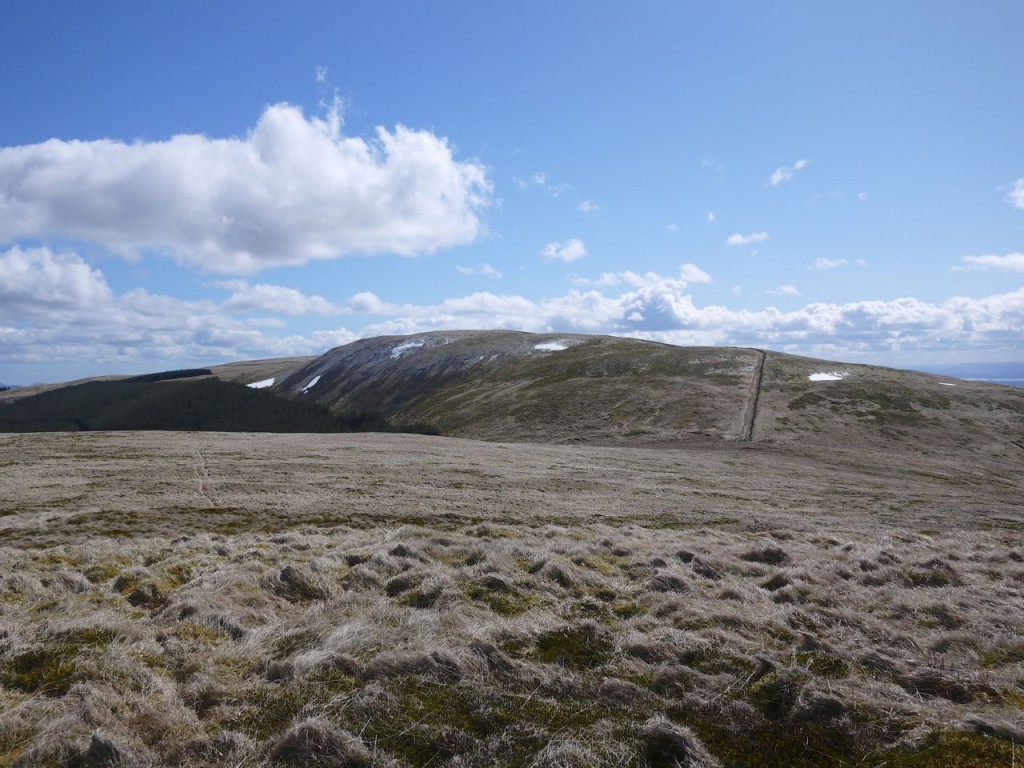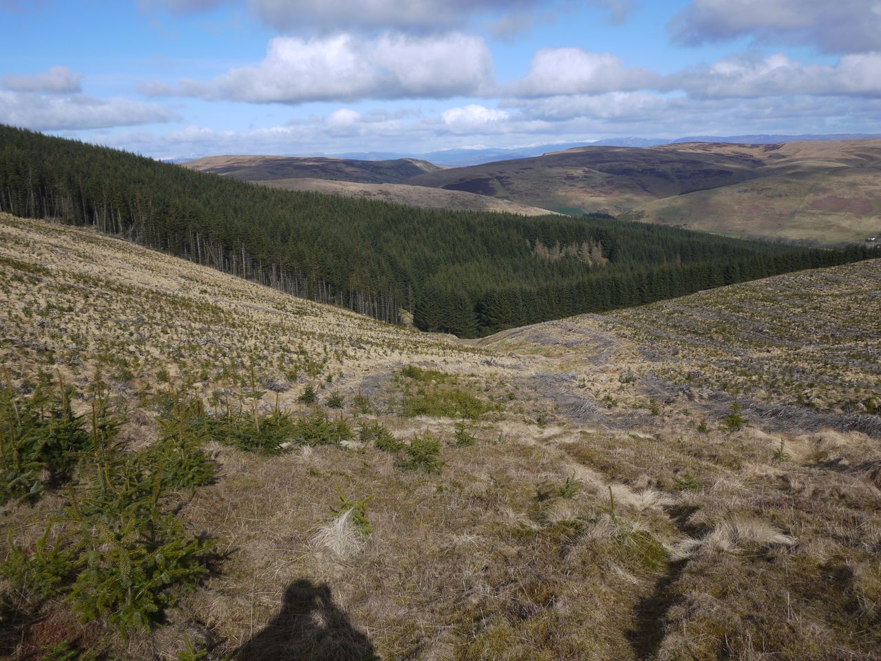 The hillside had newly planted spruce, the saplings about knee to thigh high. The track had some sections too boggy to walk across and was occasionally obstructed with the remnants of earlier felling, but the ground was mostly firm and it proved to be an easy climb. I imagine it will become a more difficult route once the trees have grown.