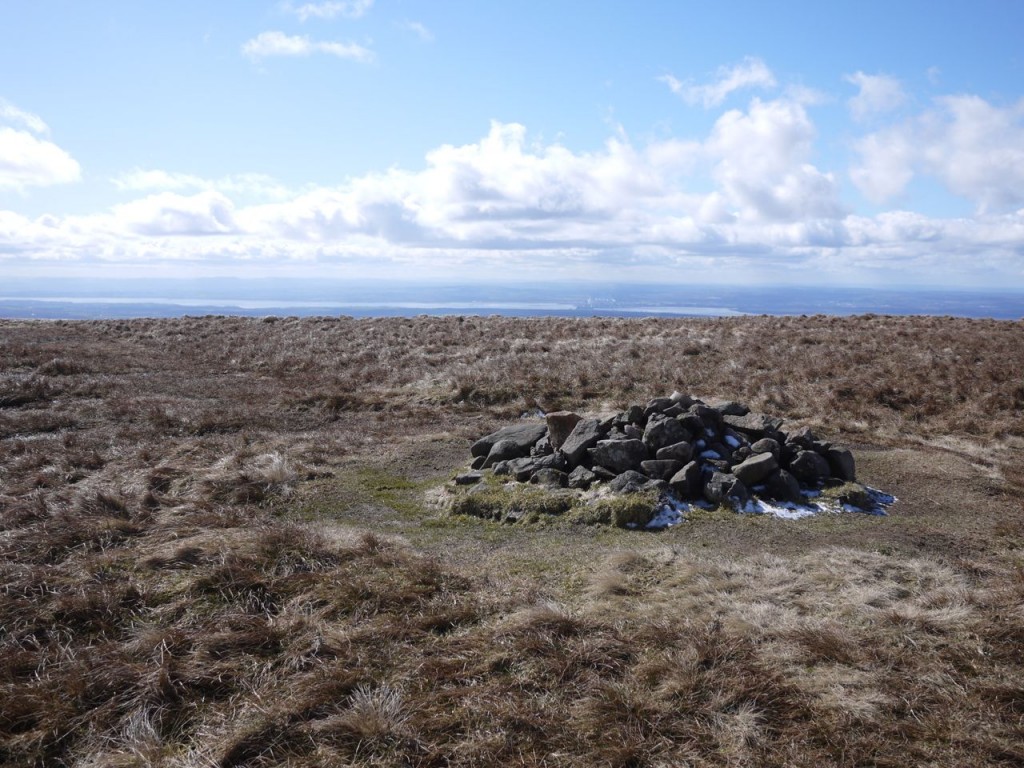 Innerdownie’s summit has a large cairn and extensive views both north, to the crystal clear snow-capped munros, and south in haze to the Forth. Just beyond Innerdownie there was a rock outcrop with a wall built to shelter the open face. A good place to shelter but it was still a bit early for a break so I pressed on.